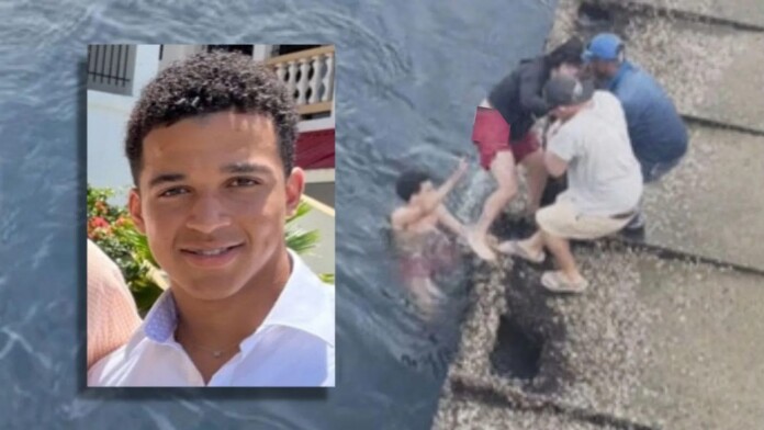 За среќа, без да мисли на својата безбедност, 17-годишниот Јакоб Томпсон ја соблекол кошулата и скокнал во каналот, пливајќи и прицврстувајќи ја жената околу половината пред да се врати на цементниот ѕид.
